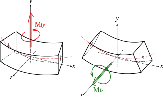 Forțele rezultante din ultimele două cazuri formează momente care sunt egale ca mărime și sunt opuse ca direcție. Acest moment încovoietor corespunde deformației caracteristice a unei bare (sau grinzi) supuse la încovoiere. Distribuția tensiunii într-o bară poate fi prezisă destul de precis atunci când sunt utilizate unele ipoteze simplificatoare.[1]
