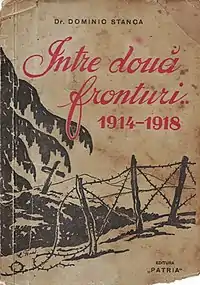 - Între două fronturi.../Dr. Dominic Stanca. – Cluj : Editura Patria, 1935, 324 p.[nefuncțională – arhivă] — Memorie și cunoaștere locală; Biblioteca Județeană „Octavian Goga” Cluj; accesat la 18 martie 2018