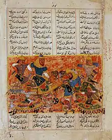 - Doar două Șah-Namé ilustrate sunt cunoscute din perioada domniei Muzaffarid, primul produs în 1371, cu doar douăsprezece picturi, iar al doilea - în 1393-1394, la scurt timp după distrugerea din dinastia Muzaffarid de mâna lui Timur, cu șaizeci și șapte.[19]