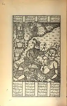 Ultimul Šāh-nāma litografiat cu ilustrații a fost finalizat la Teheran în 1909 sub sponsorizarea lui Ḥosayn-Pāšā Khan Amir Bahādor, un oficial influent Qajar la sfârșitul secolului al XIX-lea și începutul secolului al XX-lea.[20]