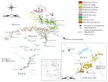 Majoritatea podgoriilor se află în departamentele franceze: Aisne (2.000 ha), Aube (6000 ha) și Marne (22.000 ha). Câteva podgorii se întind și în departamentele Seine-et-Marne și Haute-Marne.