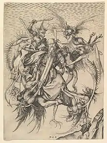 ![]() Schița Ispitirea Sfântului Antonie, de Martin Schongauer; Antonie e arătat că e atacat de draci |