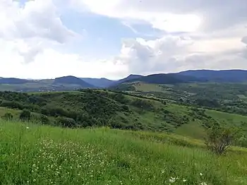![]() Perspectivă dinspre Dealul Ghindăului (situat la est) a Șeii Crăcăoani. În ultimul plan se află Munții Neamțului. | |