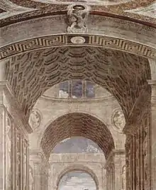 Pictura a pornit de la boltă, pentru a continua până la zidul de est, unde s-a înfățișat Disputa Sacramentului, iar pe zidul de vest este redată Școala din Atena.