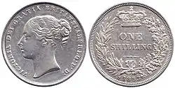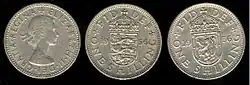 - +FIDEI DEFENSOR+ONE SHILLING, în română: „Apărătoare a credinței, un șiling.”