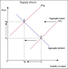 Diagrama din dreapta demonstrează un șoc negativ al ofertei; Poziția inițială este în punctul A, producând cantitatea de ieșire Y1 la nivelul prețului P1 . Când există un șoc de aprovizionare, acesta are un efect negativ asupra ofertei agregate: curba ofertei se deplasează la stânga (de la AS1 la AS2 ), în timp ce curba cererii rămâne în aceeași poziție. Intersecția curbelor cererii și ofertei s-a mutat acum, iar echilibrul este acum punctul B; cantitatea a fost redusă la Y2, în timp ce nivelul prețurilor a fost crescut la P2 .