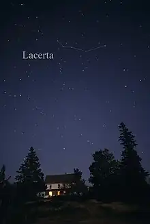 Constelația Șopârla văzută cu ochiul liber. Pentru identificarea mai ușoară au fost trasate linii între stele.