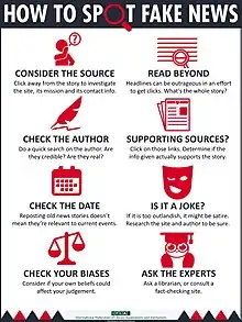 International Federation of Library Associations (IFLA) a publicat un ghid (a se vedea poza alăturată) pentru a ajuta cititorii să recunoască știrile false.[13] Principalele recomandări sunt: