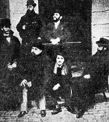 Editori ai ziarului Adevărul în 1897 (de la stânga, sus: Russe Admirescu, Ioan Bacalbașa, C. Bacalbașa; de la stânga, jos: Constantin Mille, V.I. Pella, C. Balaban).