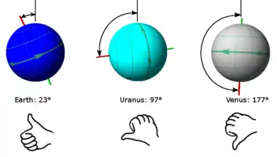 Înclinarea axială a trei planete din Sistemul Solar, Pământ, Uranus și Venus. Axa Pământului este înclinată la aproximativ 23°