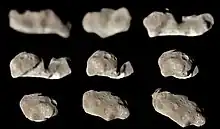 ![]() Imaginea cu cea mai mare rezoluție a lui Dactyl, făcută în timp ce Galileo era la 3,900 km distanță față de satelit | |