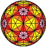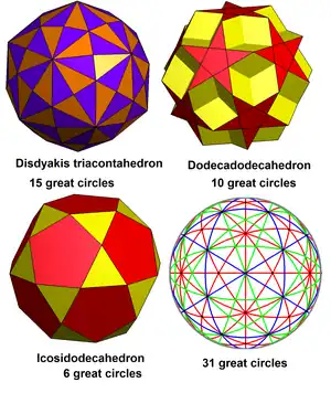 Cele 31 de cercuri mari sunt afișate aici în 3 direcții, cu simetrie cu 5, 3 și 2 poziții. Există 4 tipuri de triunghiuri sferice dreptunghice determinate de cercurile mari intersectate, prezentate colorat în imaginea din dreapta.