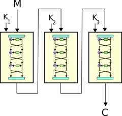 Cea mai simplă variantă de 3DES funcționează astfel: , unde este blocul în clar iar , , și sunt cheile DES. Această variantă este cunoscută sub notația EEE deoarece toate cele trei operațiuni efectuate cu cheile sunt criptări. Pentru a simplifica interoperabilitatea între DES și 3DES, pasul din mijloc se înlocuiește de obicei cu decriptarea (modul EDE): și astfel o singură criptare DES cu cheia poate fi reprezentată ca 3DES-EDE cu cheile . Alegerea decriptării pentru pasul al doilea nu afectează securitatea algoritmului.