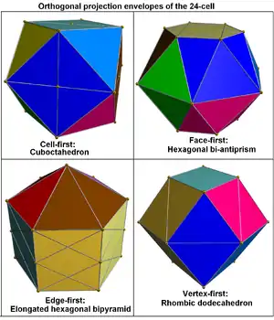 Proiecțiile ortogonale pot fi folosite pentru a arăta diferite orientări ale simetriilor unui 4-politop. Acestea pot fi proiectate în 2D ca grafuri ale vârfurilor și laturilor și pot fi reprezentate în 3D cu celulele vizibile ale anvelopei convexe.