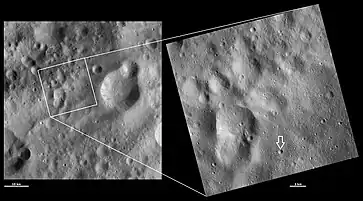 Cratere Vestane în diferite stări de degradare, cu canale în josul imaginii (6 august 2011)