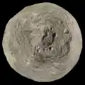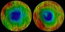 Diagramă de altitudine a lui 4 Vesta (după cum este determinată din imaginile telescopului spațial Hubble din mai 1996) văzută din sud-est, arătând craterul Rheasilvia la polul sud și Feralia Planitia lângă ecuator