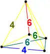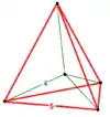 ![]() Proiecția unui 5-celule cu un vârf în față are o anvelopă vizibilă tetraedrică. Vârful cel mai apropiat al 5-celule este cel din centrul tetraedrului, cu roșu. Cea mai îndepărtată celulă se proiectează pe anvelopa tetraedrică propriu-zisă, în timp ce celelalte 4 celule se proiectează pe cele 4 regiuni tetraedrice, aplatizate (degenerate în proiecția 3D), care înconjoară vârful central. |