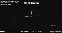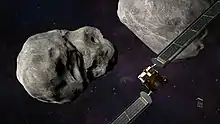 ![]() Didymos (stânga jos) și Dimorphos (dreapta sus) fotografiat de sonda spațială DART | |