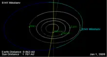 Orbita asteroidului 8141 Nikolaev și poziția sa în 1 ianuarie 2009