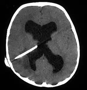 ![]() Scanare tomografică a creierului, unde se poate observa abcesul cerebral la un pacient cu un dren ventricular.[1] | |