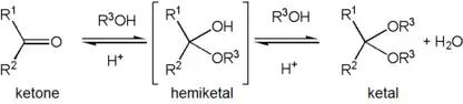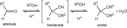 Formarea unui acetal are loc în momentul în care o grupă hidroxil a unui hemiacetal devine protonată și pierde apă. Carbocationul care este produs se atașează rapid de o moleculă de alcool. Concomitent cu pierderea protonului de la alcoolul atașat se obține acetalul (sau cetalul):