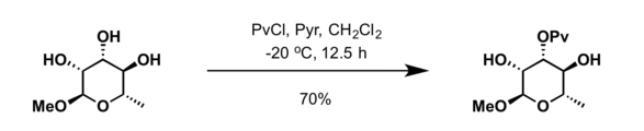 Grupa pivaloil ce provine de la acidul pivalic este utilizată ca grupă protectoare în sinteza organică. O metodă comună de protejare este tratarea alcoolilor cu clorură de pivaloil (PvCl) în prezență de piridină și diclorometan.[9]