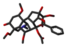 Aconitina este un alcaloid foarte toxic produs de unele specii de Aconitum. În China, compusul este utilizat în doze mici ca analgezic și ca agent de coagulare.[2] Nu are antidot.