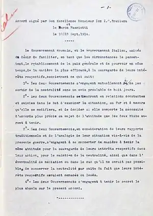 Principalele prevederi ale acordului prevedeau obligația părților de a nu ieși din neutralitate fără un aviz prealabil de 8 zile precum și consultări reciproce permanente și acțiuni de comun acord în problema menținerii sau ieșirii din neutralitate.