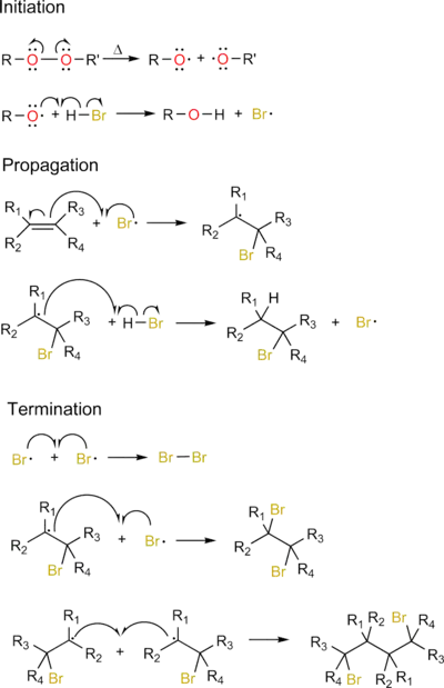 Ca și exemplu ilustrativ, se poate lua în considerare adiția anti-Markovnikov de acid bromhidric la o alchenă. În această reacție, este necesară adăugarea unei cantități catalitice de peroxid organic (R-O-O-R'), pentru a induce formarea radicalilor de brom. Totuși, pentru o reacție totală trebuie ca acidul bromhidric să fie adăugat cantitativ (echimolecular). Trebuie avut în considerare și faptul că radicalii organici se vor forma la carbonul cel mai substituit, din motive de stabilitate.