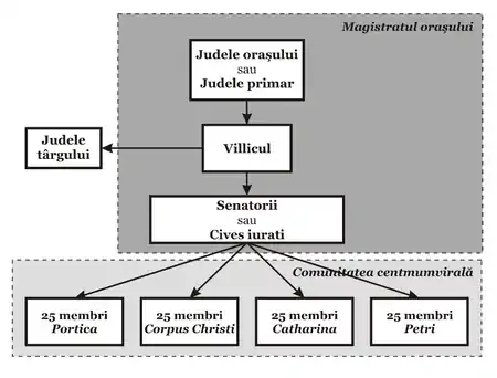 - Senatorii sau Jurații („cives juratii”), inițial patru, mai apoi 16 (probabil corespunzător celor patru cartiere ale cetății: Portica, Corpus Christi, Catharina și Petri). Au fost menționați prima dată în 1342 (4), mai apoi la 1353, urmând ca din 1397 să fie menționați 16 oameni. Senatorii erau numiți de către judele primar și villic, mai apoi urmând să fie confirmați de către Comunitatea centumvirală.