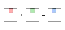 Pentru a putea fi adunate, două matrici trebuie să aibă același număr de linii și coloane.[1] În acest caz, suma a două matrici A și B va fi o matrice care are același număr de linii și coloane ca și A și B. Suma lui A și B, notată A + B, se calculează prin adunarea elementelor corespunzătoare din A și B: