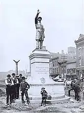 Statuia din Haymarket a fost vandalizată cu vopsea neagră la 4 mai 1968, a 82-a aniversare a atacului de la Haymarket, în urma unei confruntări între poliție și demonstranți la un protest împotriva războiului din Vietnam.[77] La 6 octombrie 1969, la scurt timp înaintea protestelor „Days of Rage(d)”, statuia a fost distrusă de o bombă pusă între picioarele ei. Actul de vandalism a fost revendicat de organizația Weatherman, iar evenimentul s-a soldat cu spargerea a 100 de ferestre din cartier și cu împrăștierea de bucăți din statuie pe drumul expres Kennedy de sub ea.[78] Statuia a fost reconstruită și dezvelită din nou la 4 mai 1970, apoi aruncată în aer din nou de Weathermen la 6 octombrie în același an.[77][78] Statuia a fost iarăși reconstruită, iar primarul Richard J. Daley(d) a pus statuia sub pază permanentă a poliției.[78] În 1972 ea a fost mutată în holul sediului central al poliției orașului, iar în 1976 în curtea închisă a academiei de poliție din Chicago.[77] Timp de alte trei decenii, soclul gol și marcat cu graffiti al statuii a rămas pe platforma din rămășițele dărăpănate ale pieței Haymarket unde a rămas cunoscută drept punct de reper al anarhiștilor.[77] La 1 iunie 2007, statuia a fost readusă la sediul poliției Chicago cu un soclu nou, fiind dezvelită de Geraldine Doceka, strănepoata polițistului Mathias Degan.[74]