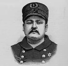 I saw a man, whom I afterwards identified as Fielding [sic], standing on a truck wagon at the corner of what is known as Crane's Alley. I raised by baton and in a loud voice, ordered them to disperse as peaceable citizens. I also called upon three persons in the crowd to assist in dispersing the mob. Fielding got down from the wagon, saying at the time, "We are peaceable," as he uttered the last word, I heard a terrible explosion behind where I was standing, followed almost instantly by an irregular volley of pistol shots in our front and from the sidewalk on the east side of the street, which was immediately followed by regular and well directed volleys from the police and which was kept up for several minutes. I then ordered the injured men brought to the stations and sent for surgeons to attend to their injuries. After receiving the necessary attention most of the injured officers were removed to the County Hospital and I highly appreciate the manner in which they were received by Warden McGarrigle who did all in his power to make them comfortable as possible.