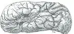 - "piciorul" (pars opercularis) și "capul" (pars triangularis) celei de a treia circonvoluțiuni frontale = aria lui Broca, a cărei leziune afectează producția vorbirii