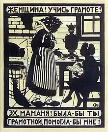 - Campania de alfabetizare: În 1917, societatea țărănească din Rusia era în mare parte analfabetă, ceea ce făcea dificilă agitația prin intermediul materialelor tipărită. A fost înființat Comisariatul Poporului pentru Iluminare pentru conducerea luptei împotriva războiul împotriva analfabetismului.[17] În 1919 au fost pregătiți instructori, care au fost trimiși în mediul rural pentru ca să califice la rândul învățători și să extindă operațiunea într-o rețea de centre de alfabetizare. Au fost create noi manuale, care explicau ideologia bolșevică noilor membri alfabetizați ai societății sovietice, iar instruirea în domeniul alfabetizării în armată a fost extinsă.[18]
