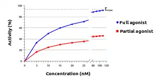 - Agoniștii parțiali (precum buspironă, aripiprazol, buprenorfină sau norclozapin) se leagă și activează și ei un anumit receptor, dar au doar eficacitate parțială comparat cu agoniștii deplini, chiar și atunci când ocupă la maxim receptorii. Agenți precum buprenorfina sunt folosiți pentru a trata dependența de opiacee tocmai din acest motiv, deoarece aceștia produc efecte mai slabe asupra receptorilor opioizi, scăzând astfel dependența și potențialul de abuz.