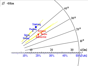 Diagrama ilustrează orbita Albiorigiană în relație cu alți sateliți neregulați prograzi ai lui Saturn. Excentricitatea orbitelor este reprezentată de segmentele galbene care se extind de la pericentru la apocentru.