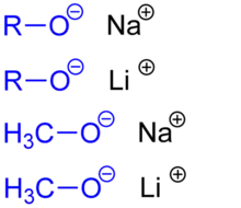 Formarea alcoxizilor poate rezulta și din reacția alcoolilor (metanol, etanol, propanol, etc) cu baze hidroxizi alcalini. De exemplu reacția generând metoxid de potasiu este o reacție reversibilă:[1]