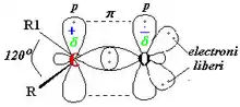 Hibridizarea sp2 mai este înâlnită și la alchene dar spre deosebire de acestea, atomul de O al grupării carbonil are electroni neparticipanți, în orbitali sp2.Dtaorită acestui fapt, precum și a diferenței mari de electronegativitate dintre carbon și oxigen. gruparea C=O are un caracter polar foarte puternic ceea ce îi permite participarea la reacții de adiție a unor compuși polari (apa, compuși organomagnezieni).