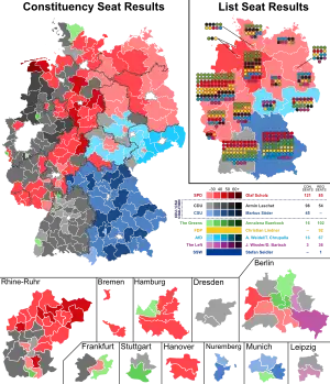 SPD a avut cel mai bun rezultat din 2005 încoace, de asemenea este pentru prima dată din 1998 când devine cel mai mare partid din Bundestag, chiar dacă a obținut doar 25%. Pentru prima dată din 1998, SPD a cucerit toate locurile de circumscripție cu un singur membru din statele Brandenburg și Saarland, unde i-au învins pe miniștrii de cabinet Peter Altmaier și Annegret Kramp-Karrenbauer.[43] De asemenea, au câștigat pentru prima dată toate circumscripțiile din Mecklenburg-Vorpommern, inclusiv Vorpommern-Rügen - Vorpommern-Greifswald I, sediul cancelarului Angela Merkel.[44] Este, de asemenea, pentru prima dată când au câștigat vreun loc de circumscripție de membru unic în Turingia și Saxonia-Anhalt din 2005.[45][46][47]