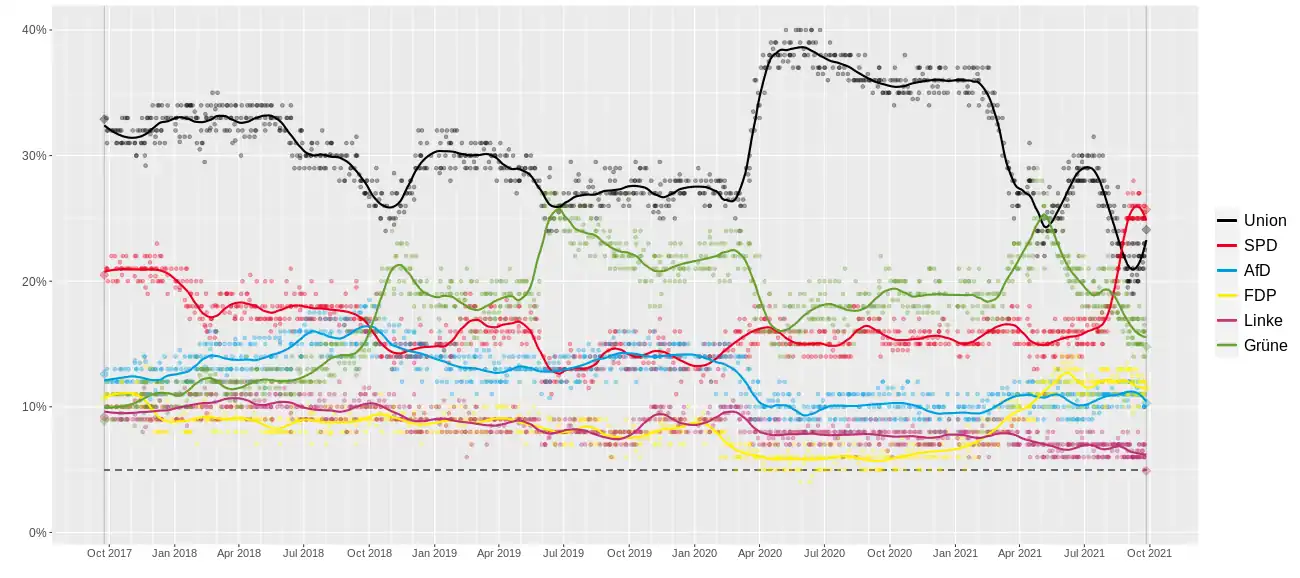 | Forschungsgruppe Wahlen | 22–23 septembrie 2021 | 1,273 | 23 | 25 | 10 | 11 | 6 | 16.5 | 3 | 5.5 | 2 |