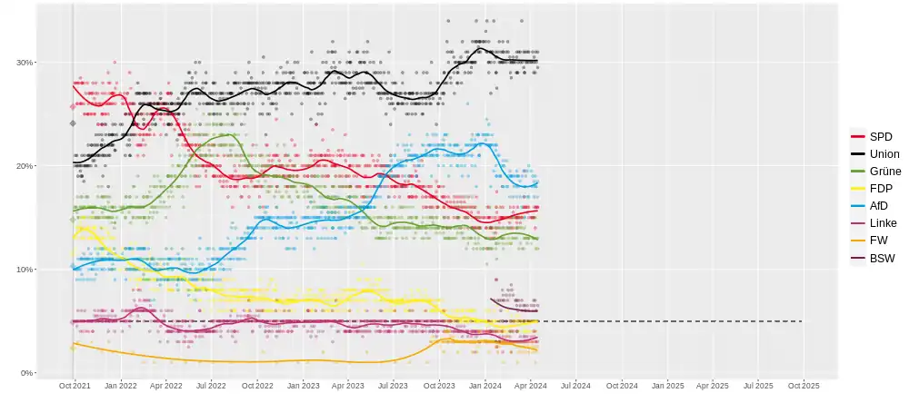 | Allensbach | 3-16 febuarie 2022 | 1,033 | – | 23 | 27 | 15 | 10.5 | 10 | 6 | 6.5 | 4 |