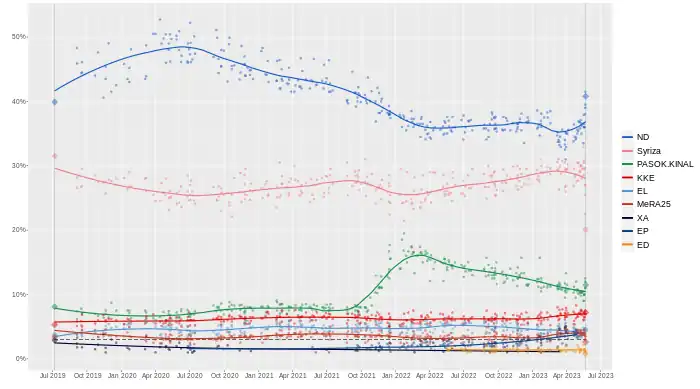 | Pulse RC/Skai[41] | 19–23 ianuarie 2023 | 1,205 | 37.0 | 29.0 | 12.0 | 6.5 | 4.5 | 3.0 | 1.0 | 3.0 | 1.0 | 8.0 |