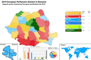 | Harta alegerilor pentru Parlamentul European din 2019 din România, cu rezultatele la nivel național, la nivel de Municipiul București și la nivel de Diaspora. | |||||||||||||||||||||||||||||||||||||||||||||||||||||||||||||||||||||||||||||||||||||||||||||||||||||||||||