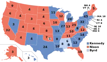În votul popular la nivelul întregii țări, Kennedy l-a învins pe Nixon pentru doar o zecime de punct (0.1%) — cea mai mică diferență la alegeri din secolul XX. În votul electorilor, diferența a fost însă mai mare, Kennedy având 303 voturi, față de doar 219 pentru Nixon (269 erau necesare pentru a fie declarat învingător).