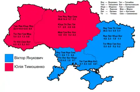- Viktor Ianukovici, Partidul Regiunilor, fost Prim Ministru și contracandidat al lui Iușcenko la alegerile din 2004 [37][38]