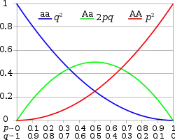 în care A și a sunt cele două alele cu frecvențele p și, respectiv, q (p + q = 1). Cele trei genotipuri posibile au frecvențele următoare: