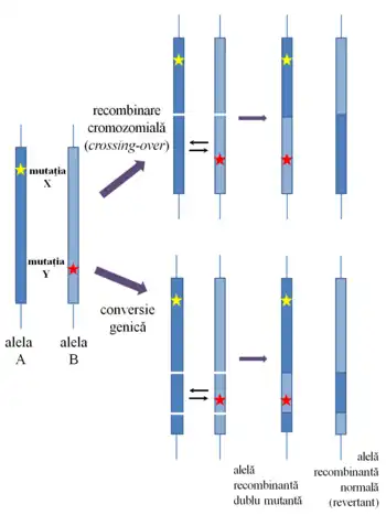 Frecvența de recombinare între cele două pseudoalele este direct proporțională cu distanța fizică ce separă cele două mutații: cu cât este mai mare (respectiv cu cât numărul exonilor genei este mai mare și cu cât regiunea genomică ce conține gena este mai mare), cu atât probabilitatea unei recombinări devine mai mare.