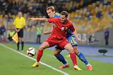 ![]() Antoniuc (în față) și Evghenii Makarenko în meciul Ucraina 1-0 Moldova, pe 3 septembrie 2014 | |||