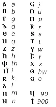 Corespondența literă-sunet, ordinea literelor și denumirile literelor ne-au parvenit printr-un manuscris al lui Alkuin, din secolul al IX-lea. Conform acestuia, existau 25 de litere, exact ca în alfabetul grecesc, la care se adaugă două litere care aveau numai valoare numerică (90 și 900). Denumirile literelor indică o contaminare între limba gotică târzie și cuvinte ale germanei occidentale timpurii. Din formele ce au ajuns la noi pot fi reconstruite forme "clasice" gotice, care în multe cazuri, corespund denumirilor vechilor rune germanice. De aici rezultă că scrierea runică a reprezentat punctul de pornire pentru atribuirea de nume literelor, și că numai unele denumiri, ca ezec, thyth, laaz, quertra, uuaer, eventual și aza, reprezintă creații noi.